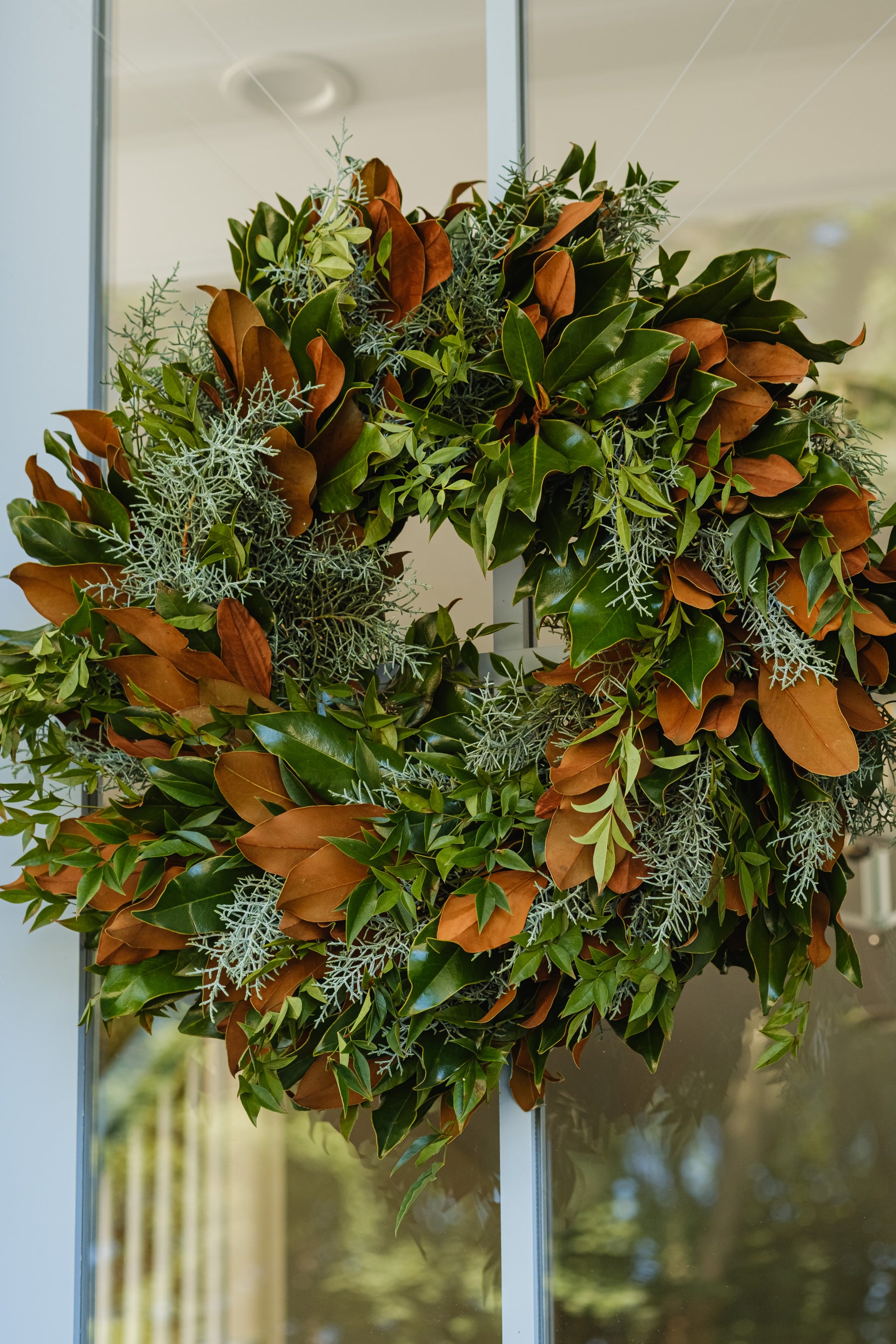 Designed in partnership with Weston Farms, this wreath features their signature fresh magnolia leaves, soft Arizona Blue Cypress, and delicate Nandina Domestica, expertly arranged by hand in North Carolina. Welcome guests in style and bring a sense of refined elegance to your front door! Coordinate your look inside with our matching Coastal Magnolia Live Bouquets.