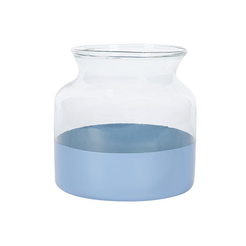 Add a pop of color to any space with our French Blue Dipped Vase. A modern take on a classic design this vase, originally a small mason jar, has been shortened to create a wider mouth, ideal for an entire bouquet. For a contemporary look, an additional splash of high-gloss French blue paint graces the bottom. The small glass jar is ideal for displaying flowers and hiding the bottom of the stems.