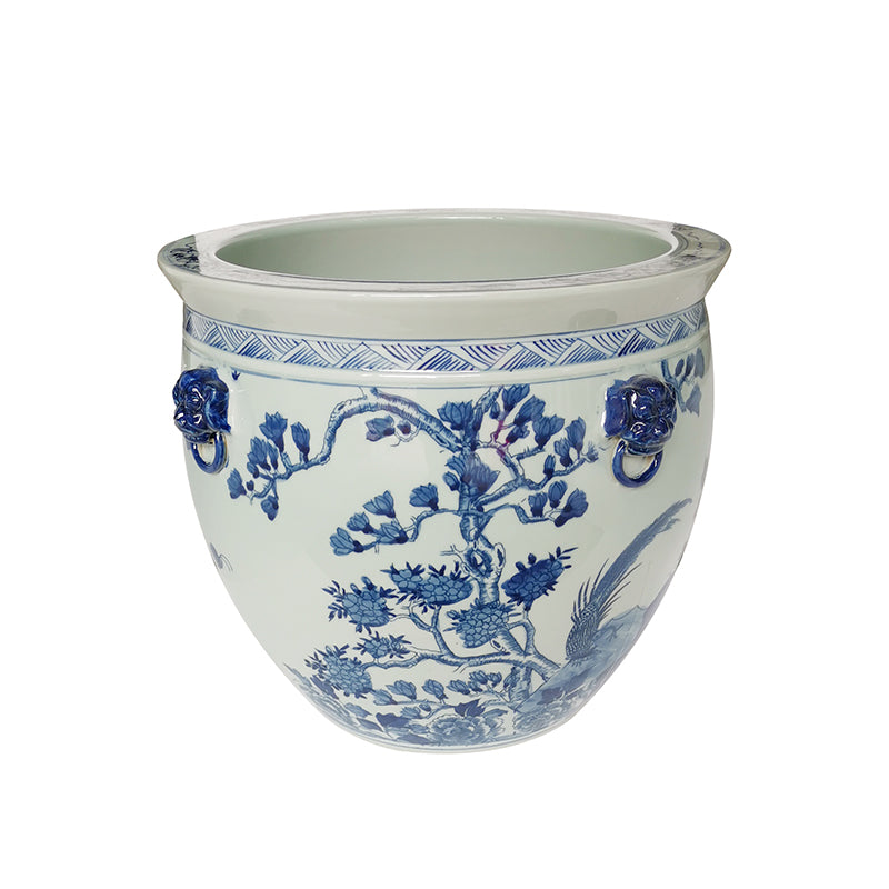 The Magnolia Planter combines classic coastal style with exceptional craftsmanship. This stunning vessel is ideal for displaying indoor or outdoor plants in an elegant manner. The hand-shaped, hand-painted ceramic Magnolia Planter is made with a special porcelain clay from the region in China where ceramics and porcelain originated thousands of years ago. This meaningful and historical connection gives it a beautifully authentic look and feel suited to luxurious surroundings. The classic blue and white color palette maintains a timeless appearance.