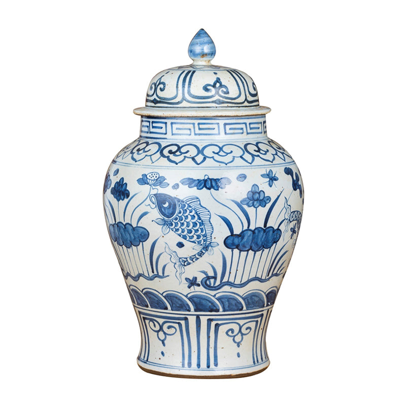 Create a classic coastal look with our Lotus Fish Temple. This beautiful large jar styles well alone or in a set of two in tall bookshelves or on a large mantle.