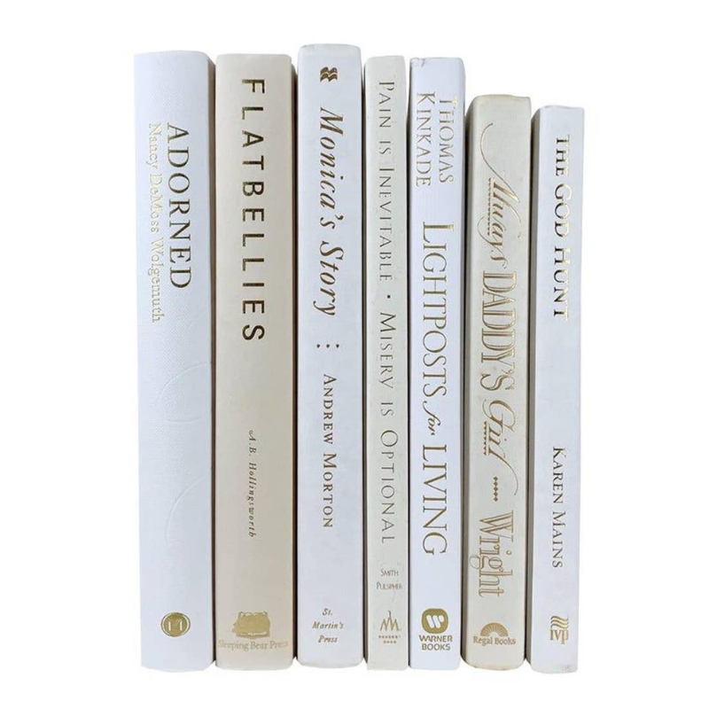 This is for 1 lineal foot of white/cream books with assortment color titles on the spine. Each foot contains 10-12 books per lineal foot. Photos are just for reference. Colors of actual books may vary. Shades of white and cream.