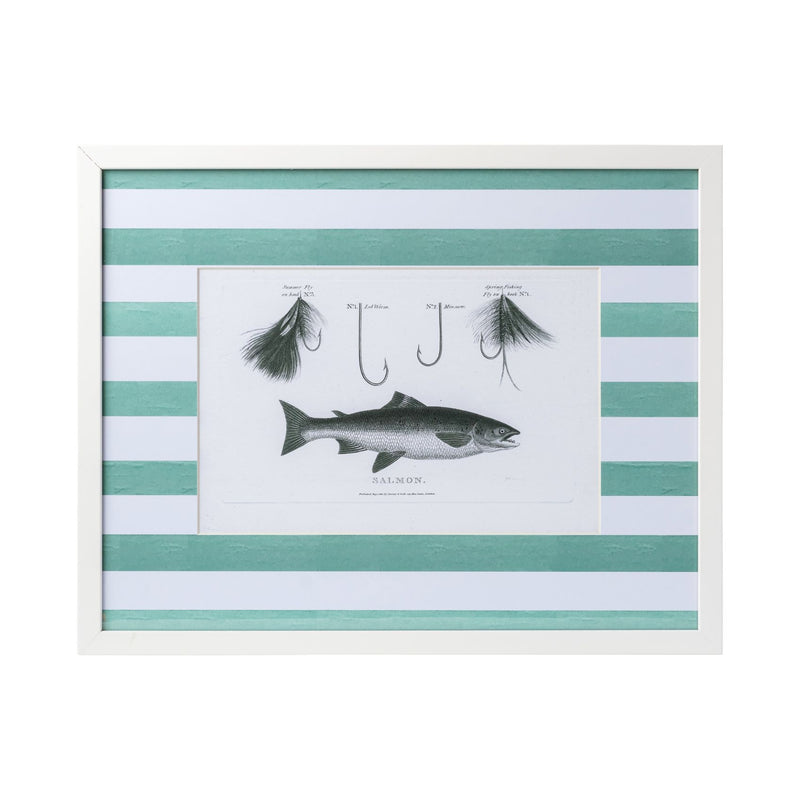 These vintage-inspired black and white fish prints showcase the trout and salmon species, bringing an outdoorsy feel to your space. Each print is accented with a striped mat—available in painterly blue, pink, or green—and finished in a custom white wood frame for a fresh, tailored look.
