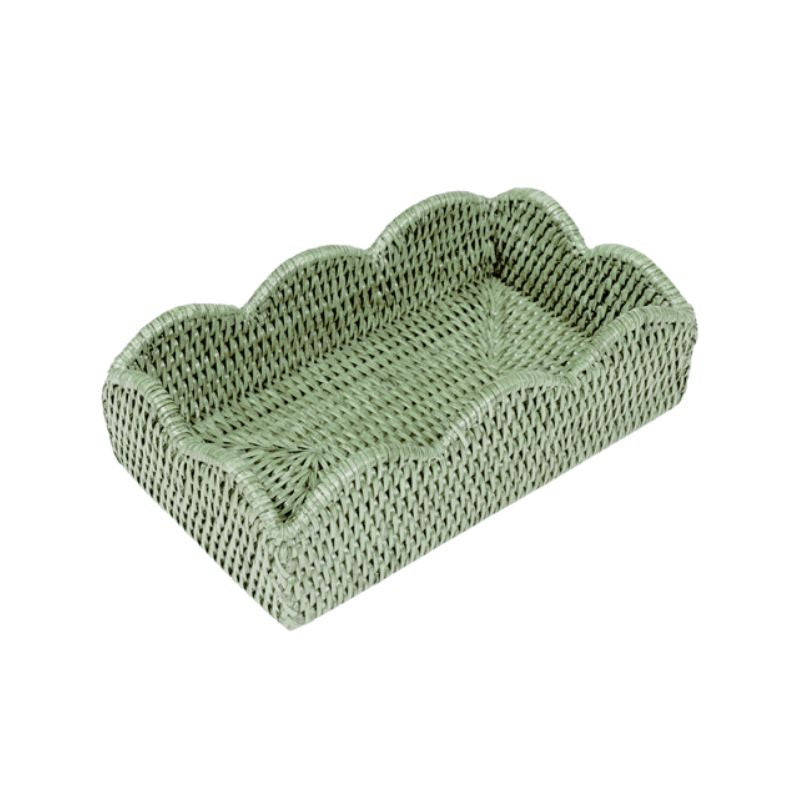 Our handwoven Scallop Rattan Guest Towel Holder is expertly crafted from durable rattan and finished in a stunning lacquered green hue. This charming piece is not just an essential for entertaining; it's a statement of style. Perfectly sized to cradle your paper guest towels, it ensures they're always neatly presented and within reach, whether adorning your guest bathroom or counter.