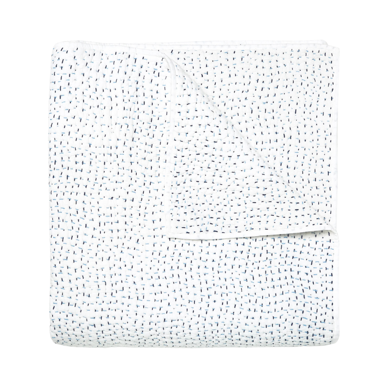 An elevated quilt set for layered, year-round comfort. Hand-stitched by artisans in India, this set offers a soft update to classic white bedding, detailed with delicate lotus-inspired stitching in classic indigo blue. Made from lightweight organic cotton voile, it’s breathable, airy, and effortless: perfect for summer nights and cozy winter mornings alike.