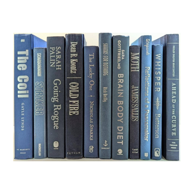 This is for 1 lineal foot of blue books with assortment color titles on the spine. Each foot contains 10-12 books per lineal foot.
