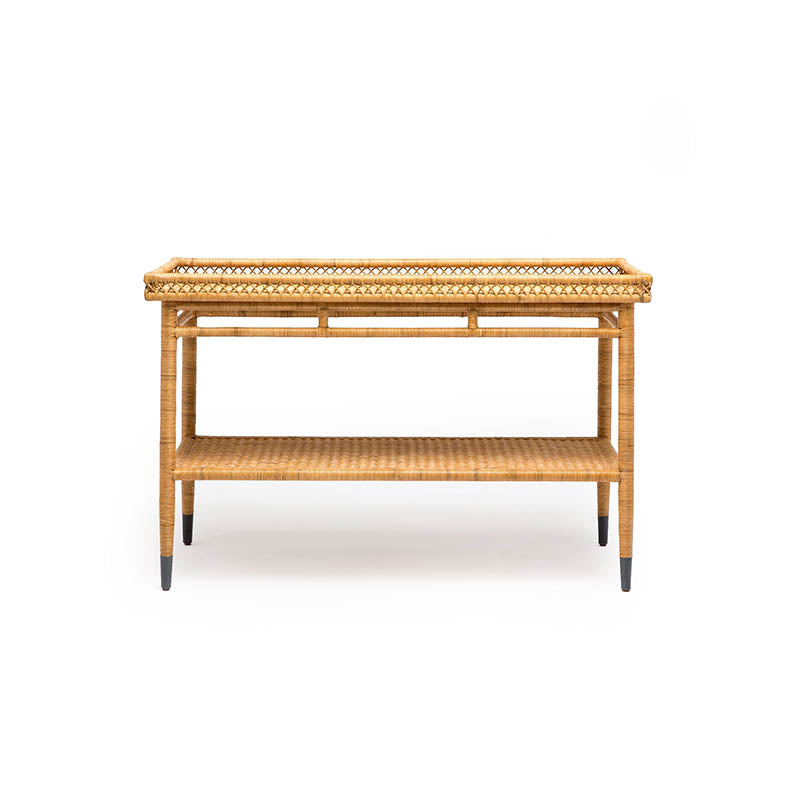Put all your cards, keys, and curio on our Darien Rattan Console table, which provides an inspired place for them to call home. Handcrafted from different hues of tightly woven rattan, the piece features a slight color variation and intricate patterns, which reveal the expert craftsmanship of this tray-style console table.