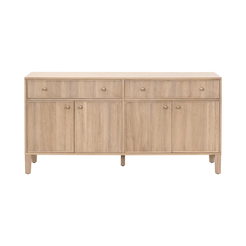Crafted from solid oak, the Encinitas Media Sideboard blends clean lines with subtle texture. Smooth drawers contrast with reeded cabinet doors, creating a quiet visual rhythm that feels both modern and timeless. With generous interior storage, it’s a functional piece for living rooms, dining areas, or anywhere you want to keep things organized—without sacrificing style.