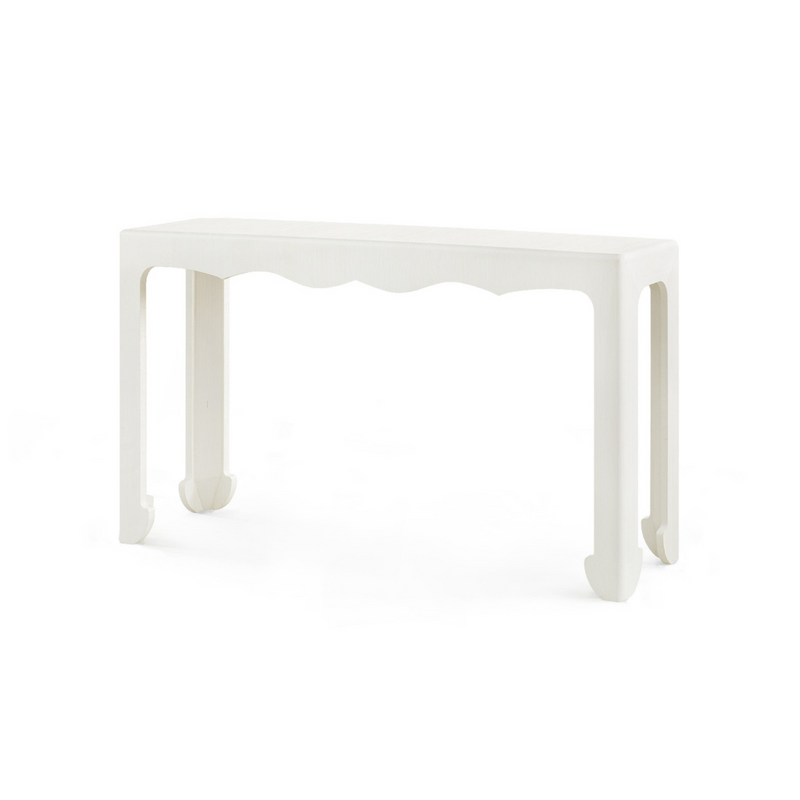 The Shores Console brings soft sophistication to any space with its scalloped trim, graceful feet, and wrapped grasscloth finish. A clear lacquer adds a subtle sheen while preserving the natural texture of the sand white grasscloth, resulting in a piece that feels both refined and organic.