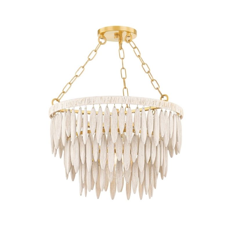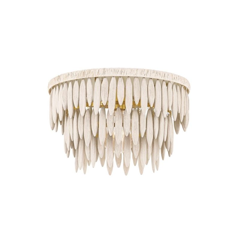 This elevated organic design blends soft natural elements with an elegant, sculptural form. A series of elongated white-washed wood beads are arrayed in tiers around an Aged Brass framework. The top ring of the frame is wrapped in white raffia adding to the clean, fresh feel. The neutral tone makes it the perfect way to add an organic, coastal vibe to a space. Available as a semi-flush, pendant, and chandelier.