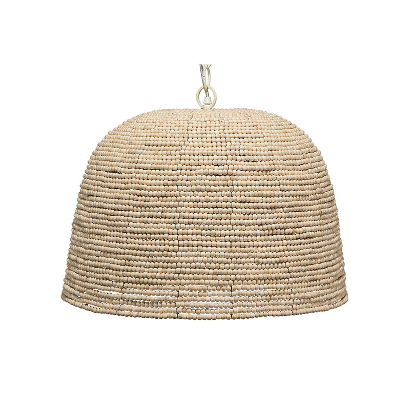 Strings of beads made with mango wood line the body of our statement South Pacific Beaded Pendant. A white iron chain compliments the natural tone and texture of this piece. Due to the use of natural wood beads, finish will vary per piece. This fun, coastal pendant looks great styled in entryways, kitchens or dining rooms.