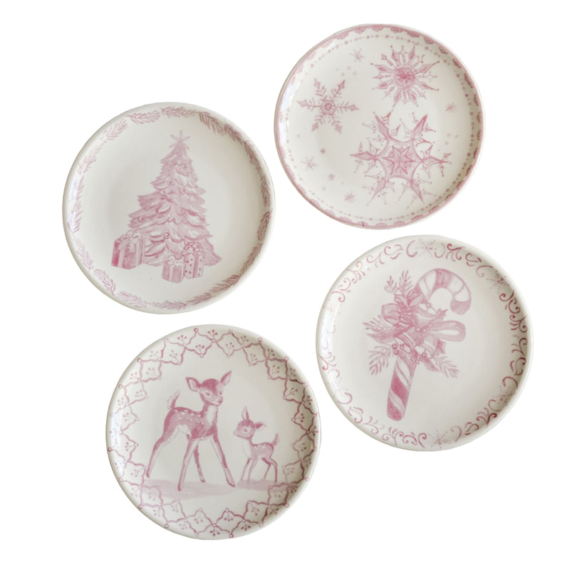 Add a charming holiday touch to your table with this set of four Sugar Plum Petite Plates. Featuring festive pink and cream designs, including snowflakes, baby reindeer, a candy cane, and a Christmas tree, these stoneware plates are perfect for serving up small bites, desserts, or treats. Whether used for holiday gatherings or as decorative pieces, these plates bring a whimsical and timeless feel to your seasonal celebrations.
