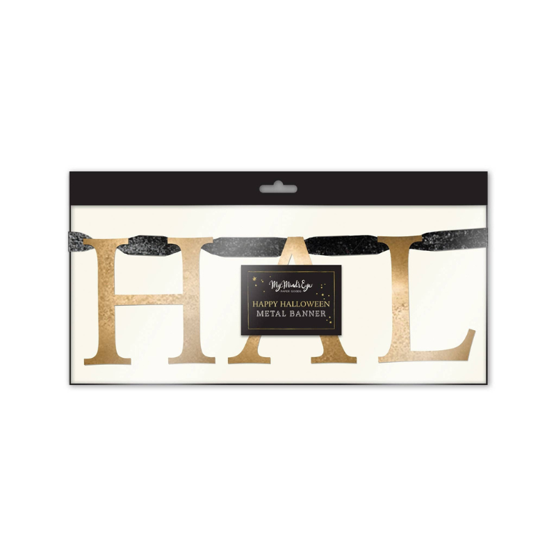 Welcome all ghosts and goblins with our Happy Halloween Banner. Crafted from cut metal letters strung on a black ribbon for an effortlessly festive addition to your Halloween entryway, mantel, or porch.