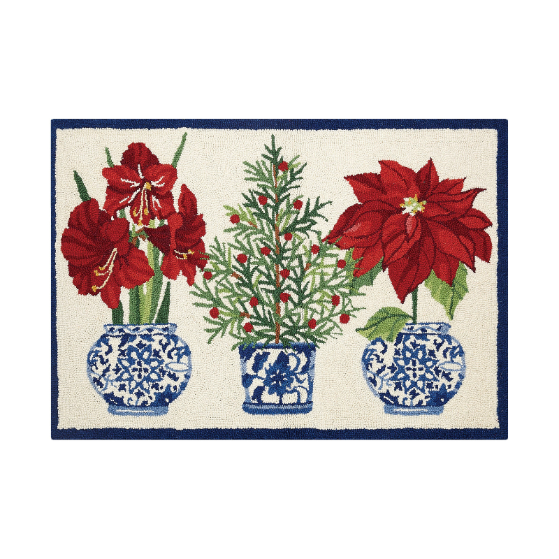 Skillfully handcrafted from 100% wool, this festive rug showcases vibrant holiday florals in classic chinoiserie vases. Perfect for adding a touch of grandmillennial style, it makes a charming accent by the fireplace, inside a door, or in front of a sink.