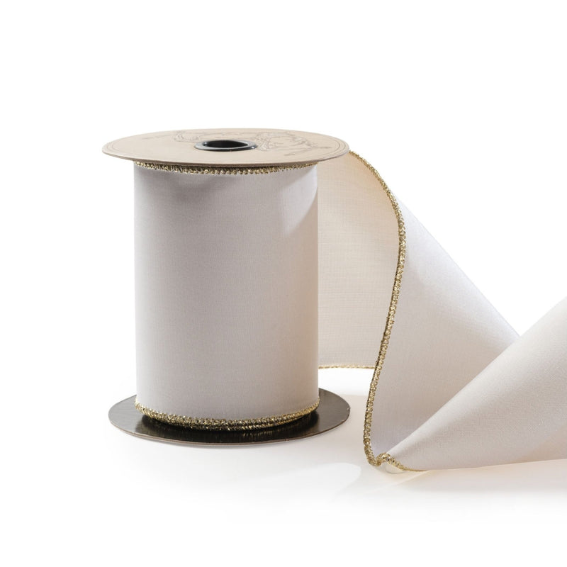 Strewn from branches or wrapped in bows, our Treetops Glisten Ribbon is an exquisite finishing touch to take your tree over the top. Featuring ivory taffeta and a gold backing, the wired ribbon ups the elegance all around.