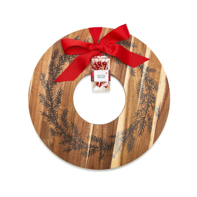 Serve in style this season with our Wreath Serving Board. Crafted in a festive wreath shape with etched greenery details, this food-safe board is perfect for presenting cheeses, hors d’oeuvres, or holiday treats. Finished with a bright red bow, it makes a charming host gift or a beautiful addition to your own holiday gatherings.