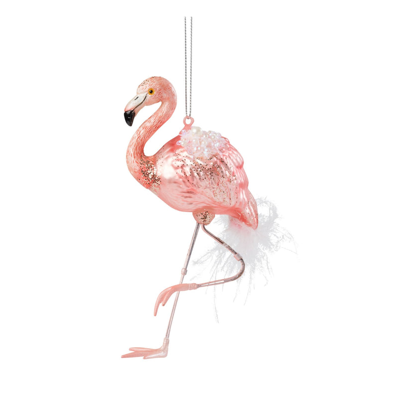 Our Jeweled Florida Flamingo Ornament adds a tropical touch to your tree. The handblown glass bird is bedecked with glitter and beads and a pink feather tail to standout amid your branches.