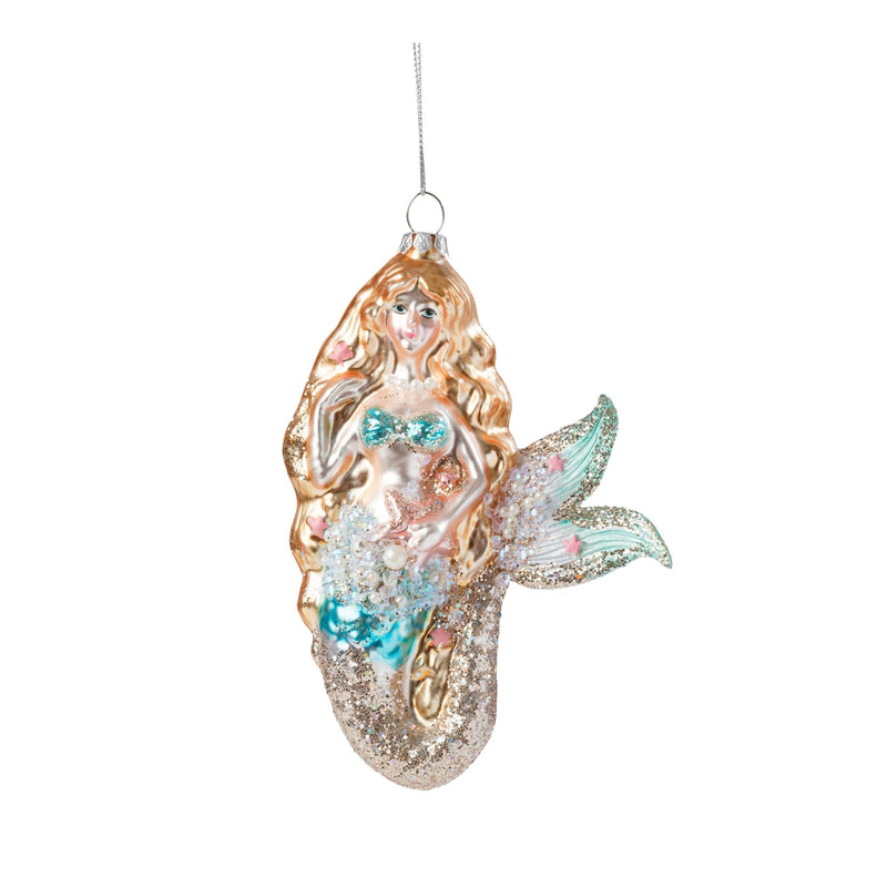 Bring the world underwater to the surface and straight to your Christmas tree. Our handblown Jeweled Mermaid Ornament is bedecked with glitter and beads for a bit of oceanic bling on your branches.