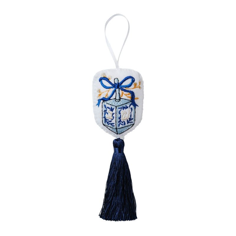 Elevate your holiday decor with our Dreidel Bauble Ornament. This unique bauble features a blue, white and gold dreidel and navy blue tassel for a playful touch. This bauble makes a statement on drawers, cabinets, tablescapes or trees.