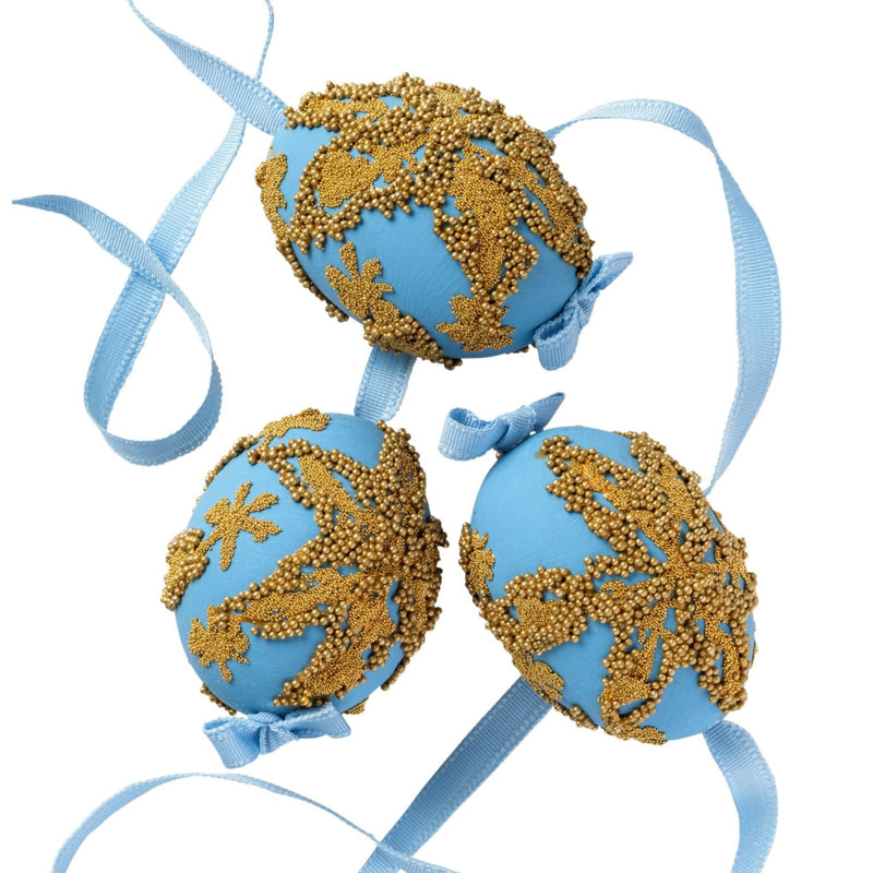 This set of three blue and gold beaded ornaments will adorn your tree with special heirloom quality that will be cherished for generations. These delicate authentic eggs are hand-painted by skilled artisans in Austria and exclusive to Cailíní Coastal.