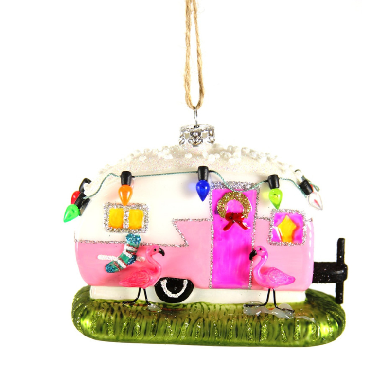 Get ready to hit the road in holiday style with this whimsical Flamingo Camper Ornament. Featuring a retro pink camper decked out in string lights, with two adorable flamingos by the door, this ornament brings a playful touch of festive charm to your tree. Perfect for those who love a bit of adventure and fun in their holiday decor, this ornament is sure to add a pop of color and personality to any festive setup.