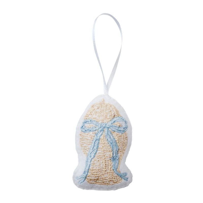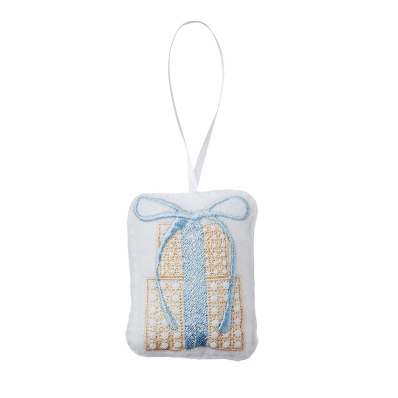Elevate your holiday decor with the refined charm of Grandmillennial style through this Cane Gift Box Bauble. Hand embroidered with a delicate cane design and pale blue bow, this gift box ornament brings a perfect balance of tradition and modernity. Perfect for embellishing not only your tree but also tablescapes, wreaths, cabinets, and drawers, these baubles offer a versatile way to infuse timeless sophistication into your festive celebrations.