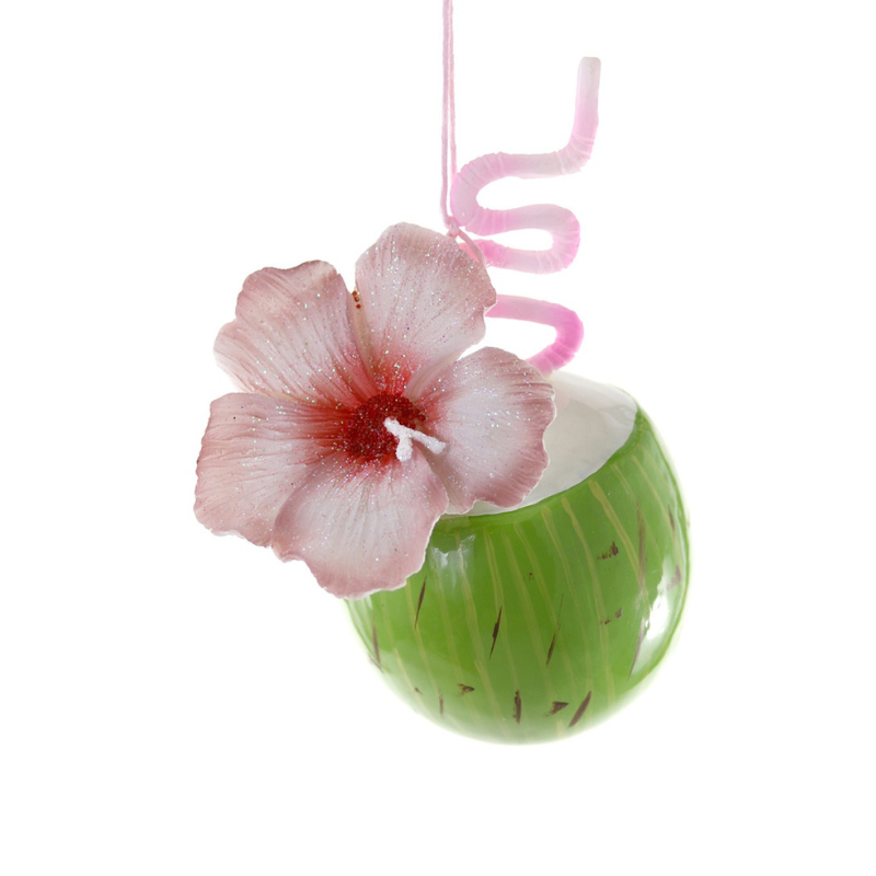Bring a tropical twist to your holiday decor with this playful Coconut Water Ornament. Featuring a vibrant green coconut complete with a delicate hibiscus flower and a fun pink swirl straw, it perfectly captures the essence of laid-back island living. Ideal for adding a splash of color and whimsy to your tree, this ornament is a delightful way to embrace a coastal or tropical holiday theme.