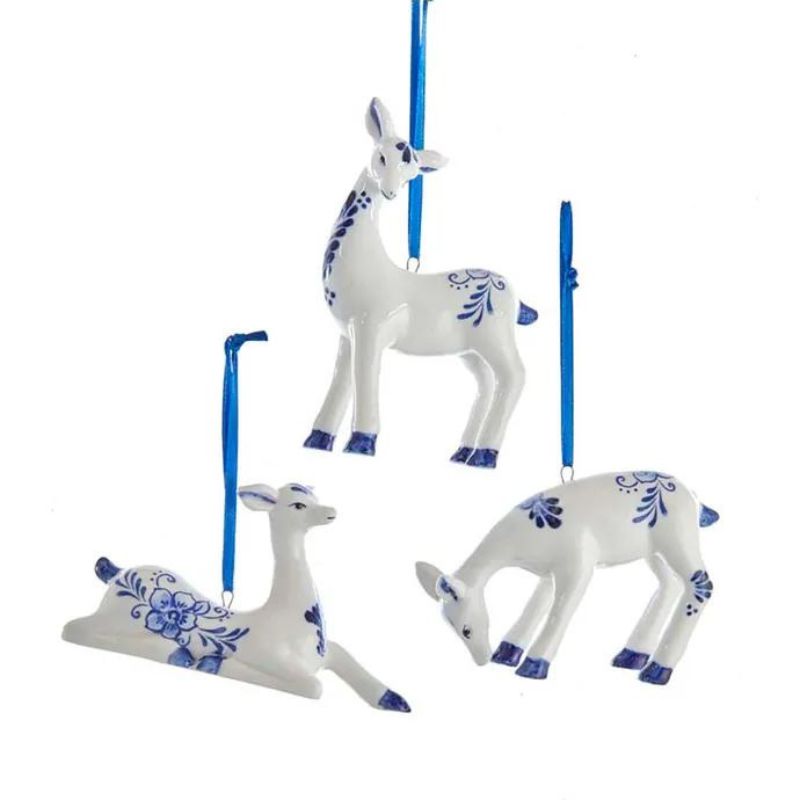 Porcelain deer ornaments are a beautiful addition to your holiday décor or Christmas tree. This assortment features three blue and white deer ornaments with a scroll and floral design.