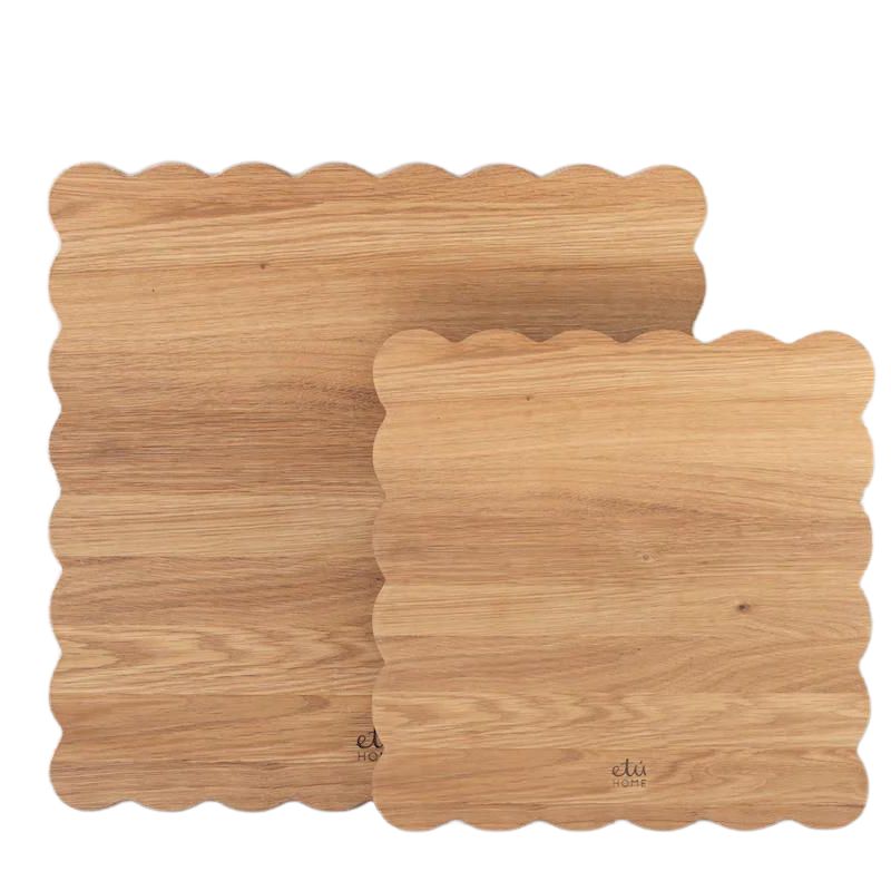 This scalloped-edge cutting board adds a modern, whimsical touch to any kitchen. Crafted from reclaimed wood, it features a square shape available in two sizes and a carefully carved scallop trim. Use this stylish yet functional coastal cutting board to slice ingredients or serve up elegant charcuterie spreads.