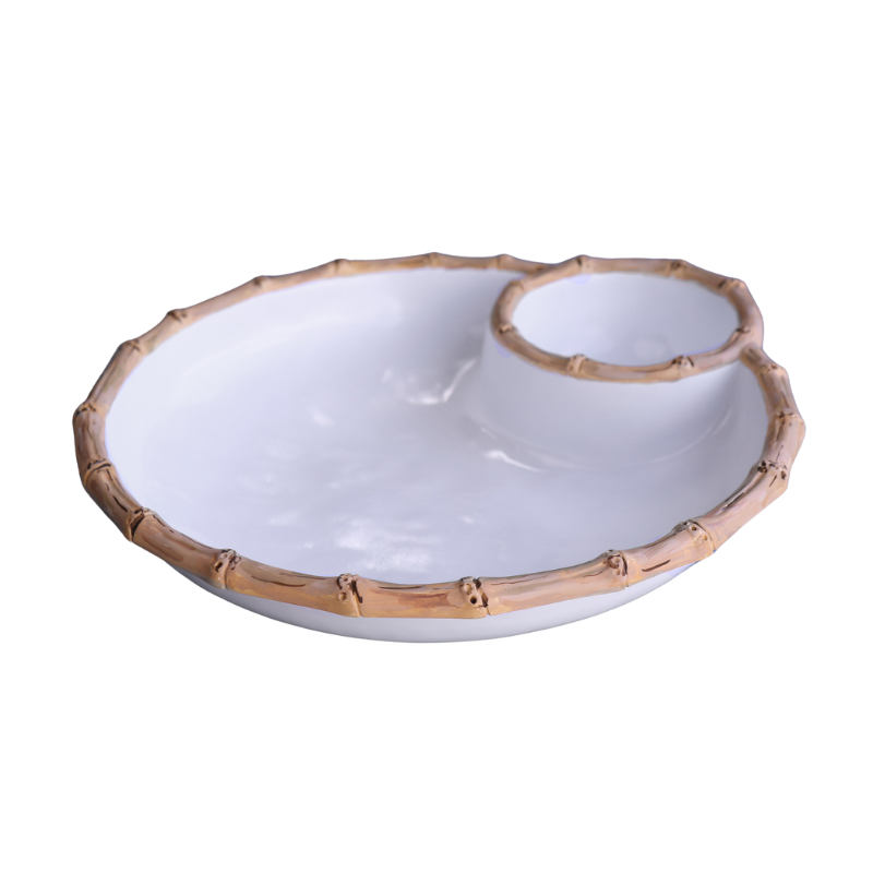 A staple for effortless entertaining, this chip and dip bowl is designed for easy, elevated hosting. The bamboo-inspired rim brings a refined, natural touch, while the durable melamine construction makes it perfect for both indoor gatherings and outdoor dining. Shatter-resistant and easy to clean, it’s a beautiful yet practical addition to any table.