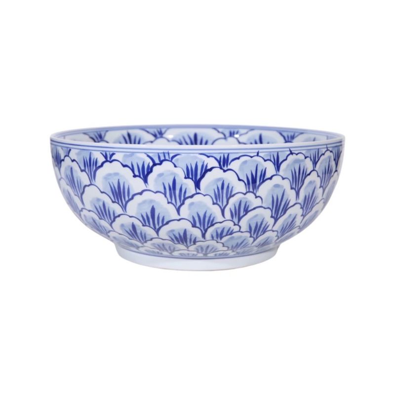 This beautiful oversized porcelain bowl is the perfect accessory for a kitchen or dining table filled with fresh fruit, florals, or boxwood spheres. It's equally as beautiful left unfilled, with a gorgeous hand painted scallop motif that wraps the interior and exterior of the bowl.