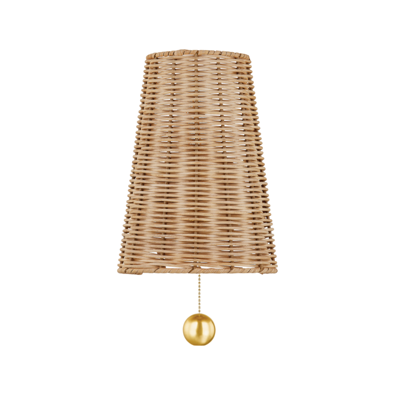 Inspired by vintage baskets, our St. Croix Sconce is a charmingly petite fixture with a vibrant personality. Its woven rattan wicker shade infuses a touch of coastal charm into contemporary interiors, blending rustic appeal with natural elegance. The sconce is elegantly finished with a chunky, whimsical pull chain in aged brass, adding a sophisticated yet playful final touch to this standout piece.