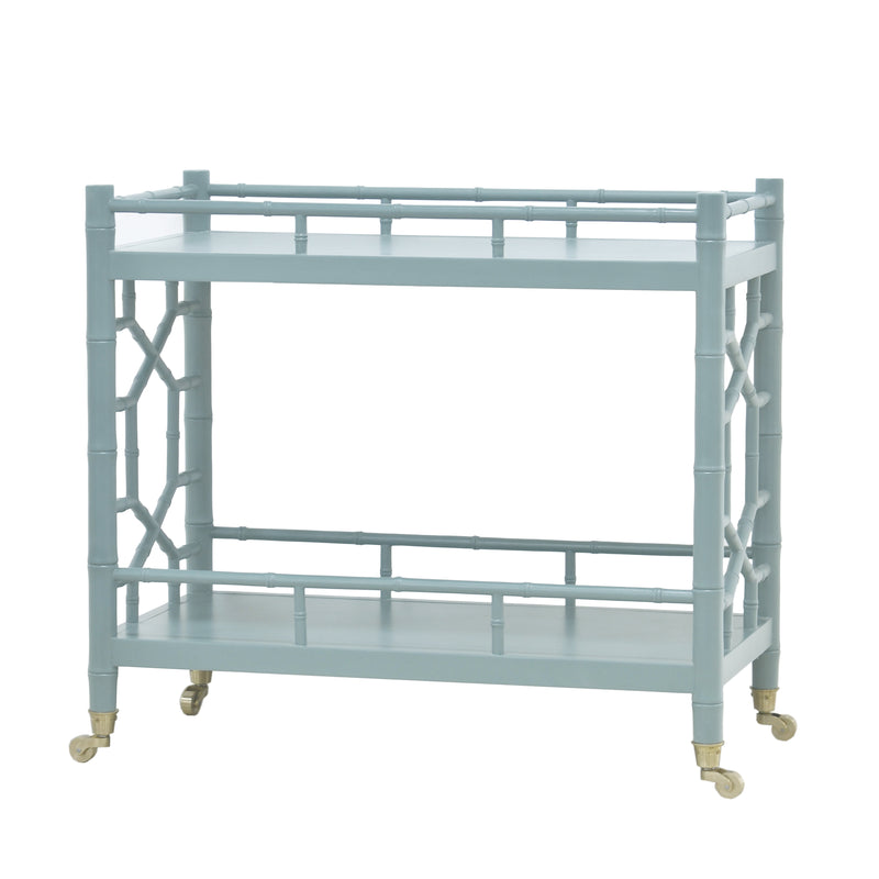 The Saline Bar Cart features an elegant bamboo fretwork frame, finished in a custom Cailíní Coastal soft blue hue. With its vintage-inspired silhouette, this piece brings a timeless charm to modern entertaining. Reminiscent of a well-loved heirloom, it’s perfect for serving cocktails on the patio, styling a chic coffee nook, or organizing books and baskets in a guest room.