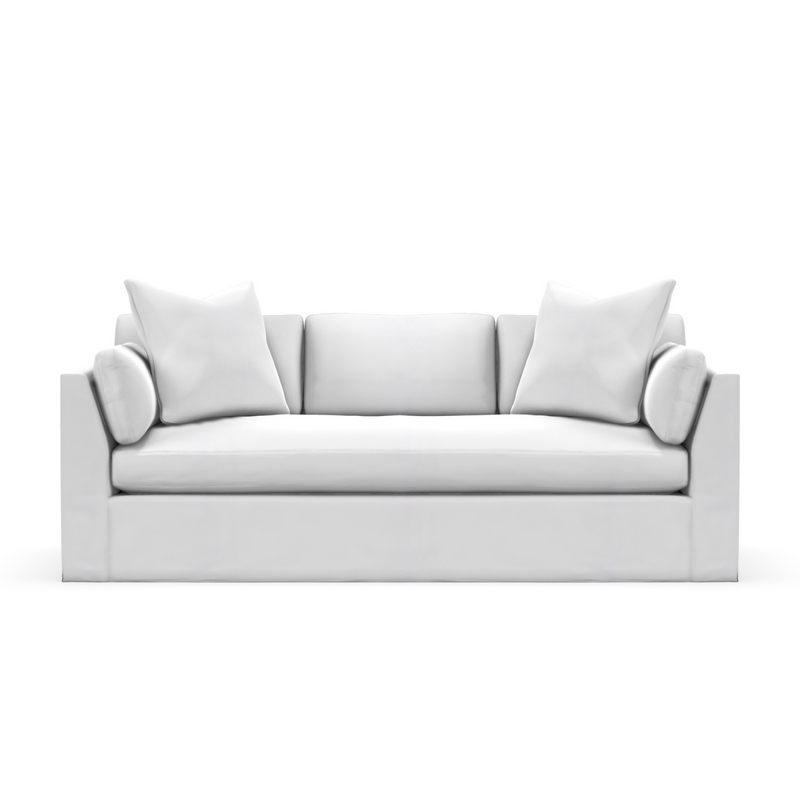 Nothing says beach house more than a bright white slipcovered sofa!  The Molly Slipcover Sofa is designed for ultimate comfort, featuring a loose box back and stylish bolsters that provide both support and sophistication. Its sleek and versatile design seamlessly fits into any space, making it a perfect addition to your home.  Made of 100% cotton this white denim performance fabric is machine washable which allows you to keep your whites truly white!