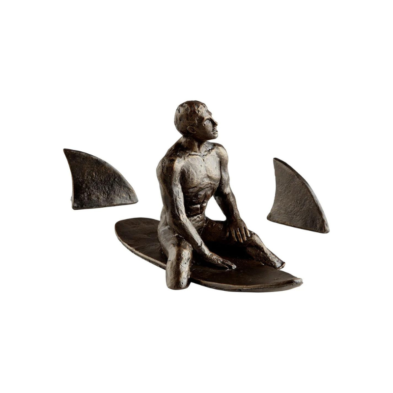 Bring a daring sense of adventure to your home with this unique surfing sculpture. Featuring an iron surfer and two fins - this decorative accessory is perfectly at home set atop coastal or surf themed coffee table book. An old world finish on this iron piece adds rich luster to a coastal style outdoor space, living room or home office.