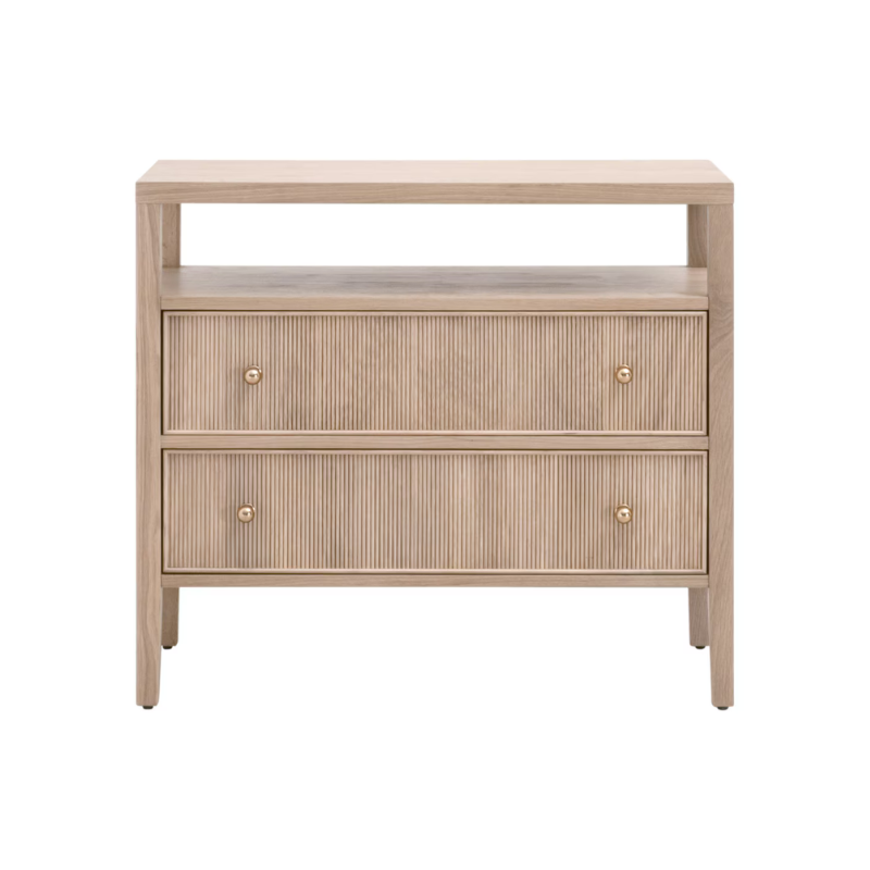 Natural texture meets clean-lined simplicity. Made of solid oak, the Encinitas Nightstand features reeded drawer fronts, subtle brass hardware, and an open shelf for styling or stashing essentials. Two spacious drawers offer hidden storage—perfect for keeping bedside necessities tucked away. A beautiful blend of form and function, ideal for coastal or modern interiors.