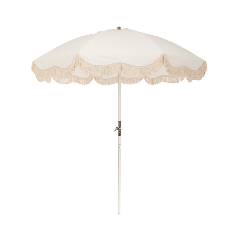 Understated and elegant, the Club Umbrella in Antique White brings a refined coastal feel to any outdoor space. The soft ivory canopy, finished with vintage-style fringe, creates a timeless look—perfect for patios, poolside lounging, or garden gatherings.