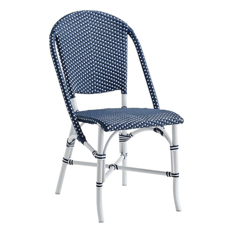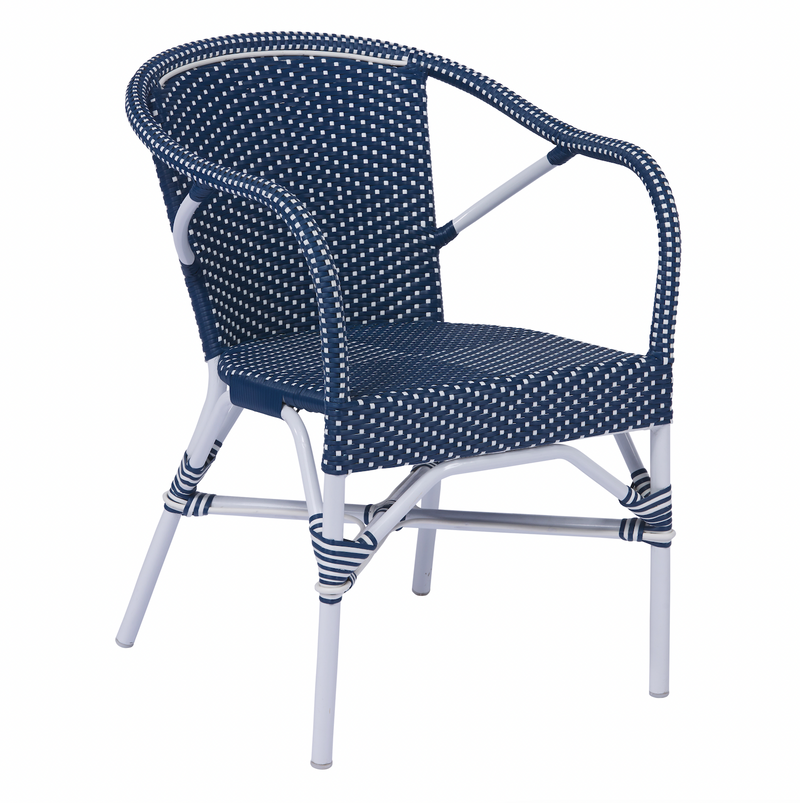 The Chatham Outdoor Dining Chair brings a modern expression to the classic bistro chair. A sturdy AluRattan™ lightweight aluminum frame with a powder-coated weather-proof finish replaces natural rattan cane for this enduring outdoor stool. ArtFibre™ is an exclusive polyethylene material and the woven back, seat and bindings are comfortable and made to stand up to daily use. These stackable outdoor chairs are virtually maintenance-free, perfect those who enjoy living and entertaining outdoors. Navy with white dots and a white aluminum frame.