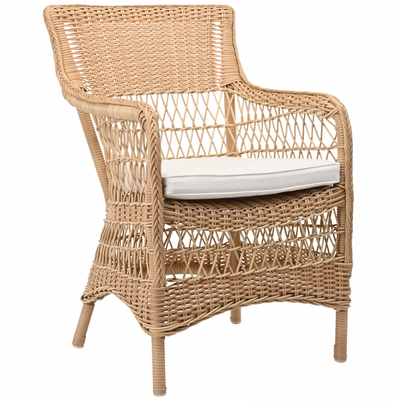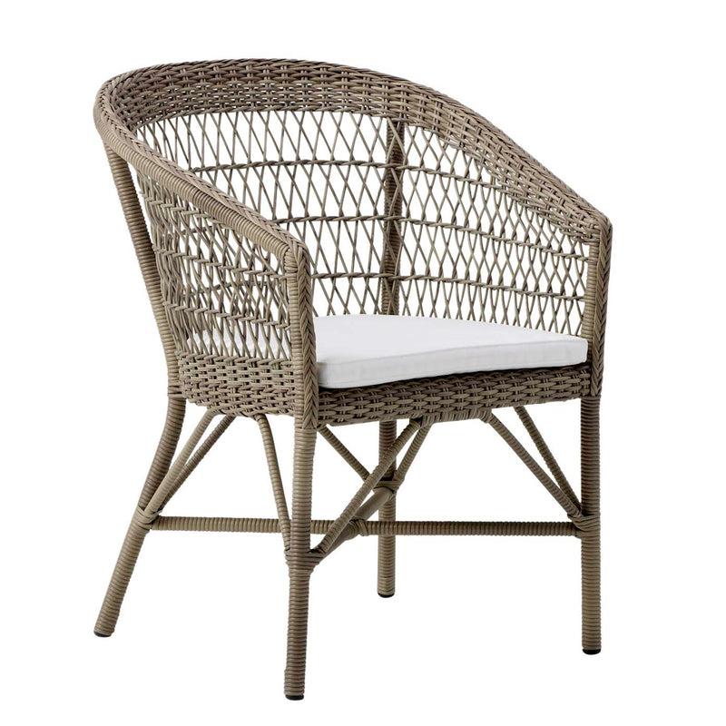 The Shelter Island Outdoor Armchair brings casual elegance and comfort to outdoor dining or lounging. An eye-pleasing design, it features a square back and wraparound apron combined with a breezy open weave. Braided detailing along the back and arms add to the elegant alfresco style and a white cushion offers seating comfort. Expertly crafted from a lightweight AluRattan™ aluminum frame woven and wrapped in polyethylene ArtFibre™ faux wicker fibers that withstand all weather conditions, this armchair stands up to year-round outdoor use.
