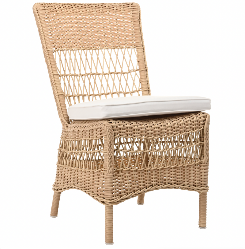 The Shelter Island Outdoor Dining Chair brings casual elegance and comfort to outdoor dining. An eye-pleasing design, it features a square back and wraparound apron combined with a breezy open weave. A breezy open weave and braided detailing along the back and seat add to the elegant alfresco style of this side chair. Expertly crafted from a lightweight AluRattan™ aluminum frame woven and wrapped in polyethylene ArtFibre™ faux wicker fibers that withstand all weather conditions, this armchair stands up to year-round outdoor use.