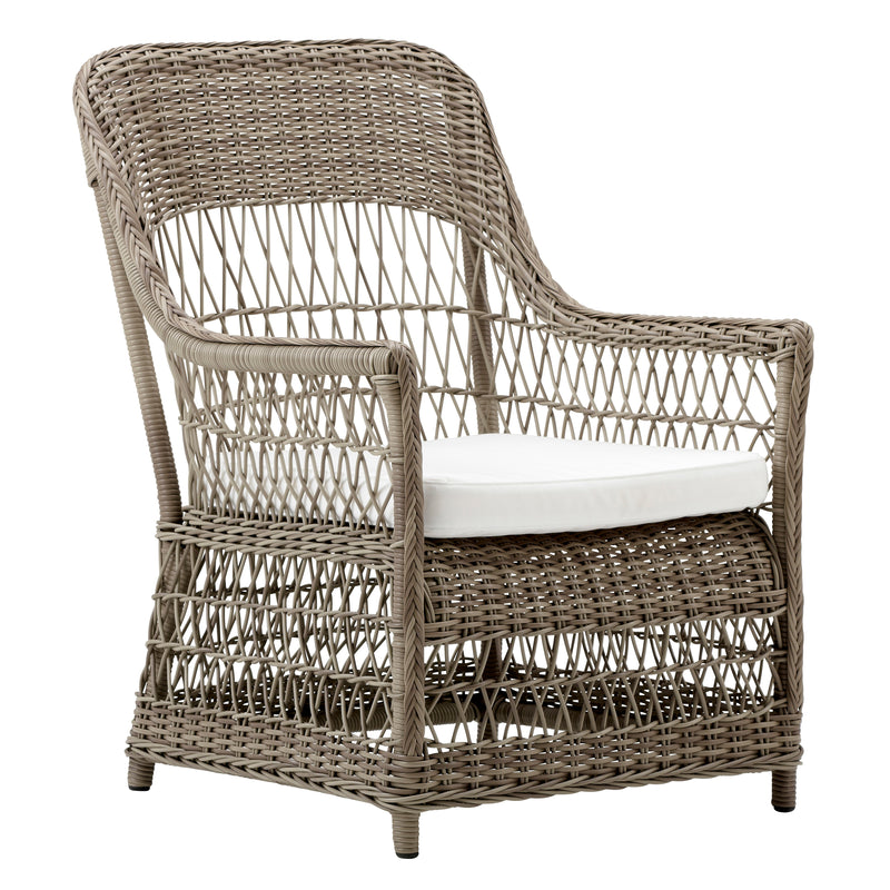 The Sag Harbor Outdoor Lounge Chair is inspired by old seaside estates. The recreated tall back chair showcases an airy, decorative woven back and apron. Designed to stand up to year-round outdoor use in a garden or patio. The frame is AluRattan™, a lightweight weatherproof aluminum wrapped and woven in a maintenance-free polyethylene ArtFibre™ wicker. A plush white Tempotest® Performance Fabric seat cushion adds comfort.