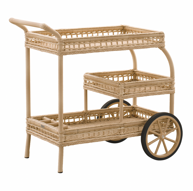 Let the good times roll from the outdoor terrace to the poolside patio with our Napeague Indoor/Outdoor Bar Cart. Featuring a curved front and a trio of offset shelves for storing food and drinks and a prominent handle and two large wheels add vintage appeal and functionality. Designed to stand in the open air and make tea time or the evening cocktail hour more pleasurable, the aluminum cart showcases distinctive basket-woven shelves with herringbone woven details. This piece showcases flexible ArtFibre™ polyethylene bindings wrapped around a durable powder-coated aluminum AluRattan™ frame to withstand long-lasting outdoor use.