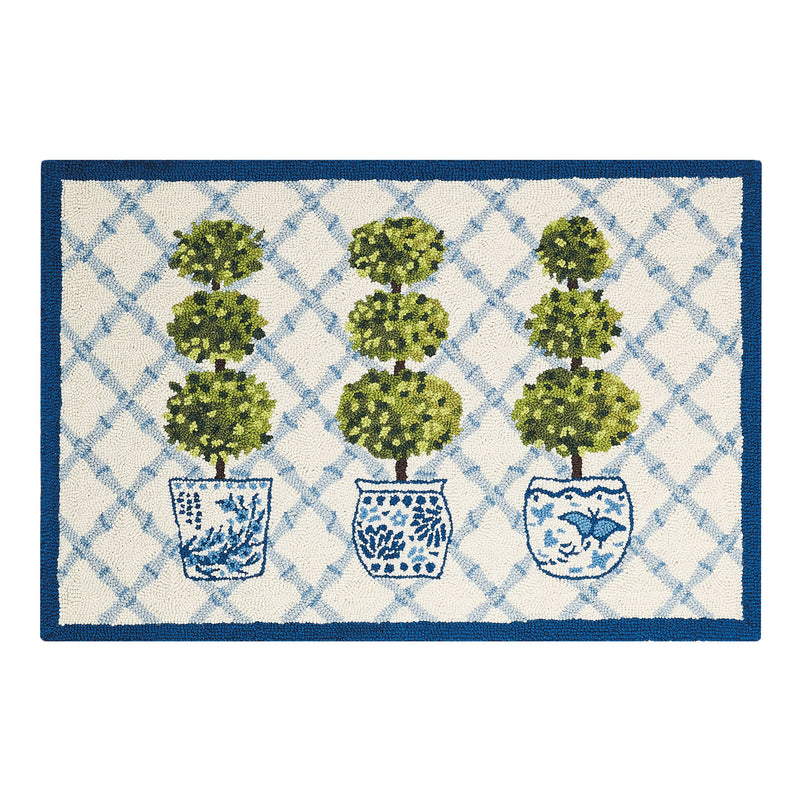 Add a touch of charm to your entryway or any small space with the Topiary Trellis Hook Rug. Crafted from 100% wool, this 2x3-foot hooked accent rug features a classic blue-and-white trellis design adorned with lush topiaries in elegant planters. Perfect as a door mat or decorative accent, it brings timeless style and a welcoming feel to your home.