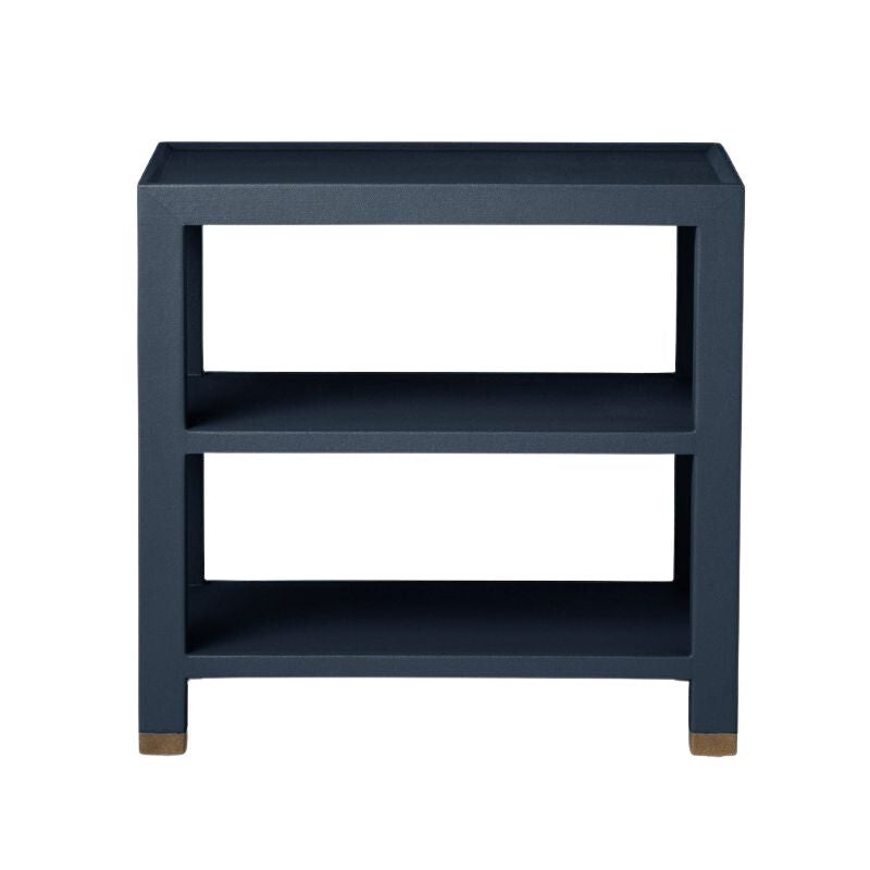 With its sophisticated form and subdued texture, the La Jolla Side Table brings style and elegance to any room. Two drawers with petite brass pulls sit elegantly beneath an open storage shelf. Finished in blue grasscloth, its the perfect accompaniment to your favorite chair. Comes with removable glass top.