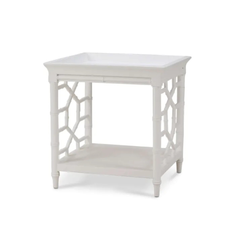 Part of our Saline Collection, the Saline Side Table combines coastal charm with functional design. Crafted from solid mahogany, it features intricate bamboo-inspired detailing and an open lattice design on the sides, adding visual interest while maintaining an airy feel. The tabletop and lower shelf provide ample space for decor or everyday essentials, making it a versatile and stylish addition to your living room or bedroom. Finished in a crisp white hue, this piece embodies effortless coastal elegance.