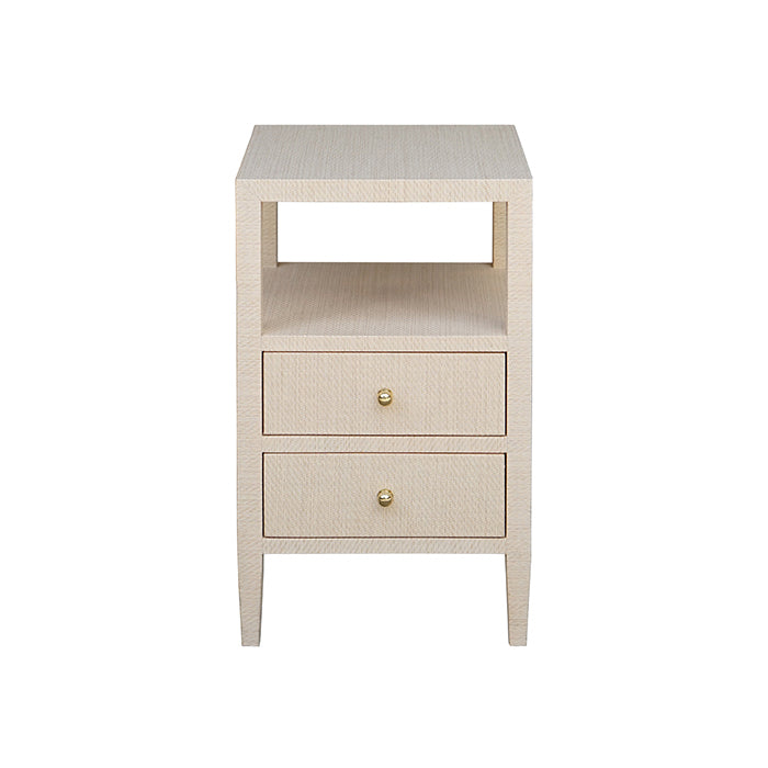 With its sophisticated form and subdued texture, the La Jolla Side Table brings style and elegance to any room. Two drawers with petite brass pulls sit elegantly beneath an open storage shelf. Finished in natural grasscloth, its the perfect accompaniment to your favorite chair. Comes with removable glass top.