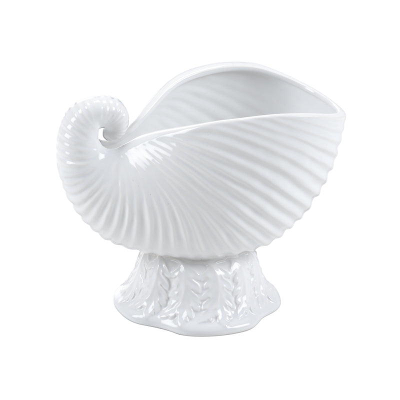 Inspired by the graceful curve of a nautilus shell, this sculptural cachepot is crafted in crisp white ceramic with softly ridged detailing. The glossy finish and classic form make it an easy accent for shelving, consoles, or tabletop styling - beautiful on its own or filled with greenery.