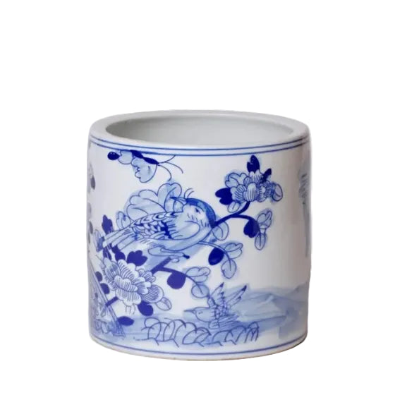 This hand-painted porcelain cachepot features a soft blue floral and bird motif inspired by classic garden scenes. Understated and timeless, its simple cylindrical shape makes it easy to style with a favorite plant or let stand on its own as a decorative accent. Each piece is handmade, with subtle variations that reflect the artistry behind it.