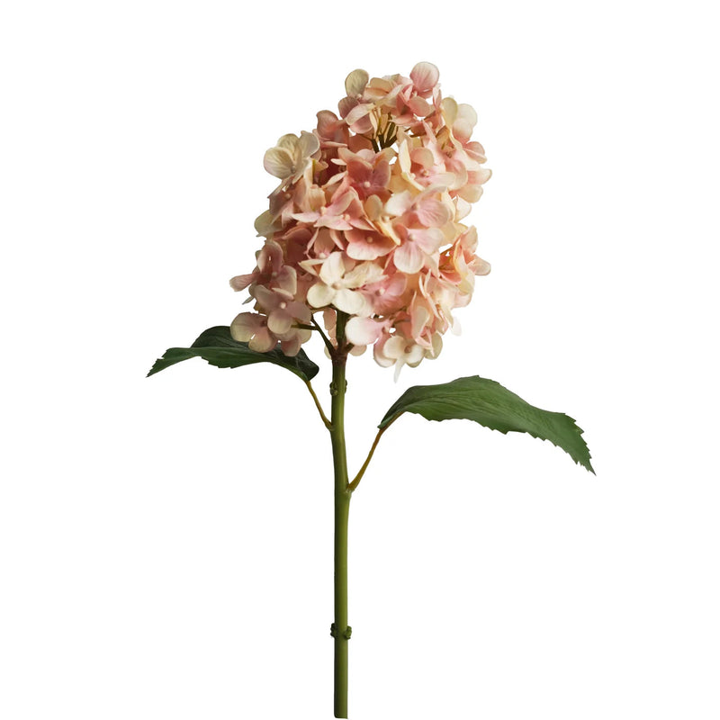 Featuring the signature cone-shaped silhouette of the panicle hydrangea, this stem offers a realistic color wash that blends cream with soft blush pink accents. With its lifelike texture and natural drape, it adds immediate height, volume, and a touch of soft color to any room.