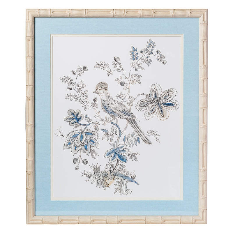 Each print is mounted with a custom light blue linen mat, adding a layer of texture and a soft pop of color that instantly refreshes the traditional imagery. It is finished in a distressed ivory faux bamboo frame.