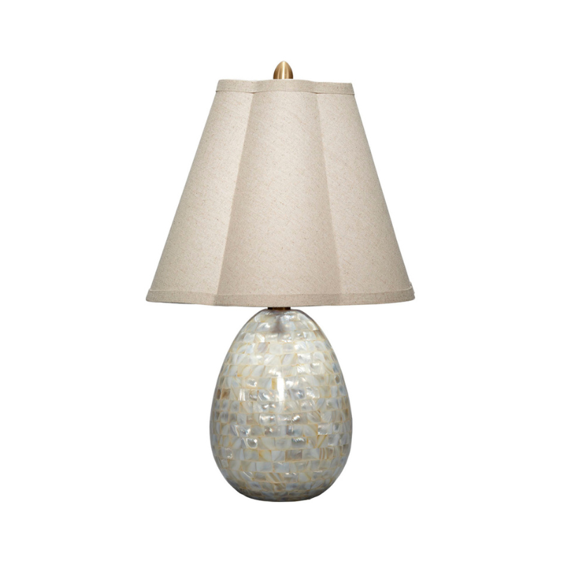 Our stunning Caspia Table Lamp features a lustrous mother-of-pearl base and hand-trimmed linen shade that is softly scalloped. A solid brass teardrop finial mirrors the luxe base’s soft curves. It is expertly crafted and an elegant addition to any room of the home.